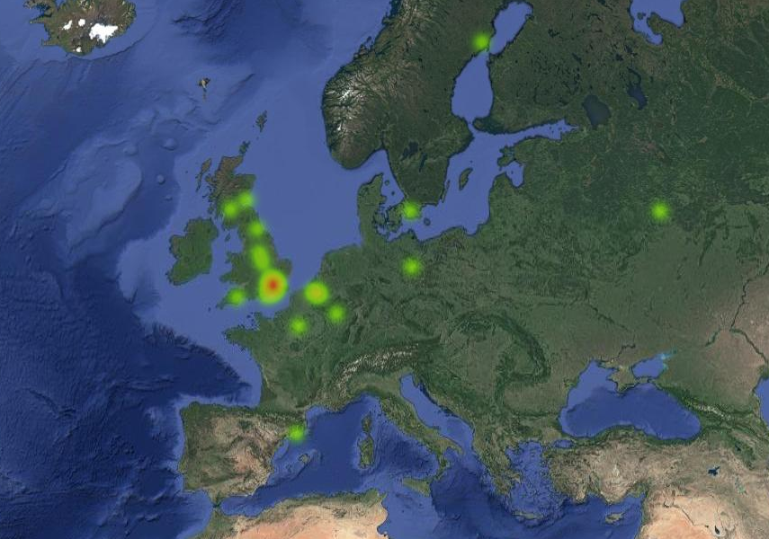 Heatmap of European Contributors to *The Programming Historian* since launch. Map produced using Google Fusion Tables.